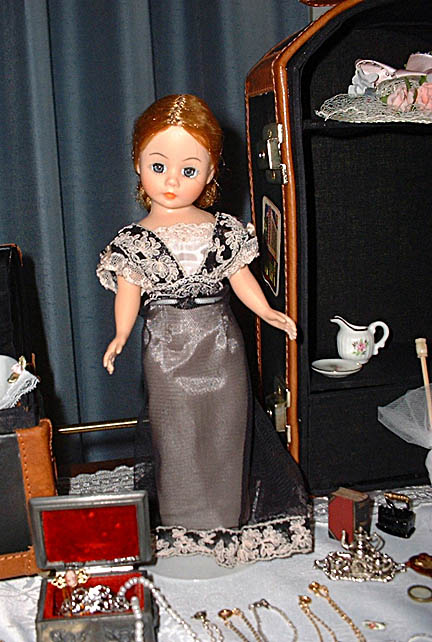 An evening dress. The jewelry box is a vintage toy.